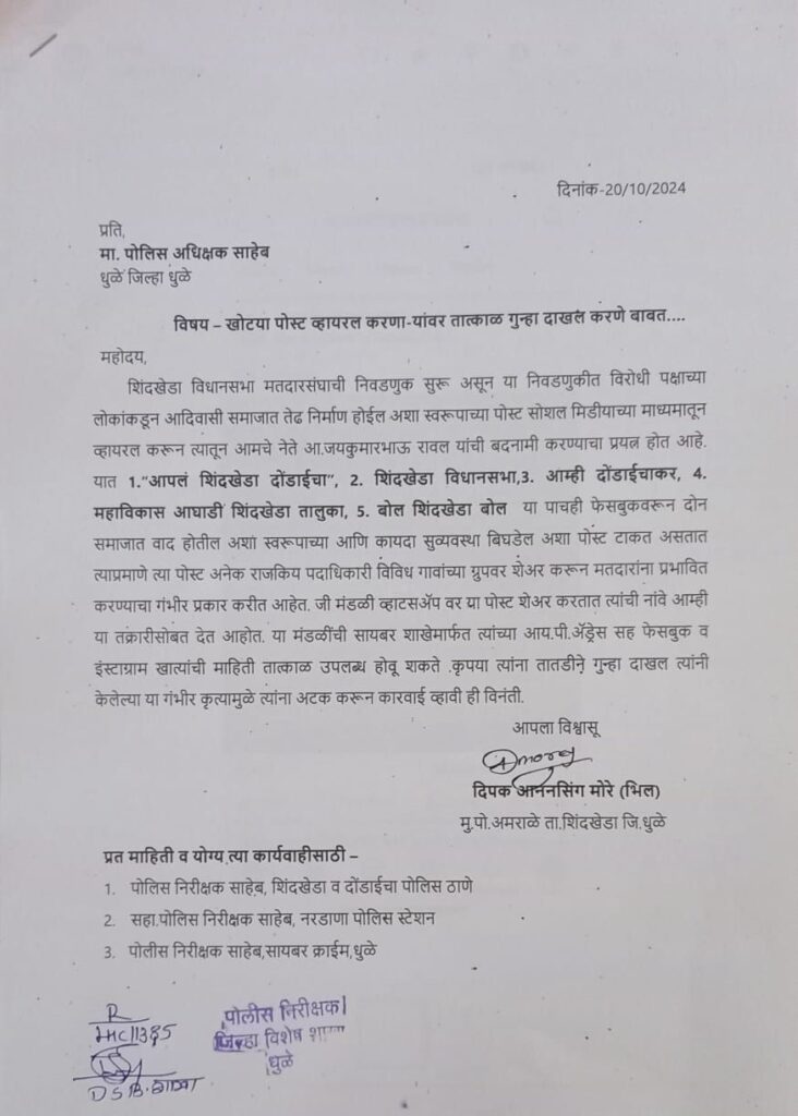 त्यांच्या तक्रारीचा आशय असा की, आ.जयकुमार रावल यांचे विरोधक विधानसभेची निवडणुकीत मतदारांवर प्रभाव पडेल तसेच दोन समाजात तेढ निर्माण होईल अशा आशयाच्या पोस्ट 1.आपलं शिंदखेडा दोंडाईचा”, 2. शिंदखेडा विधानसभा,3. आम्ही दोंडाईचाकर, 4. महाविकास आघाडी शिंदखेडा तालुका, 5. बोल शिंदखेडा बोल या पाचही फेक फेसबुक अकाउंटच्या माध्यमातून करीत असून याशिवाय काही विरोधक व्हाटसॲप च्या माध्यमातून बदनामीकारक मजकूर प्रसिध्द करीत आहेत, त्यामुळे कायदा आणि सुव्यवस्थेचा प्रश्न निर्माण होण्याची शक्यता असून या गंभीर प्रकाराबाबत तात्काळ गुन्हा दाखल सायबर सेलकडून हे फेक खाते कोण चालविते कुणाच्या व्हाटसॲप वरून हया पोस्ट शेअर होतात त्याची यादी देखील दिपक मोरे यांनी पोलिसांना दिली असून त्यांच्यावर लवकरच कारवाई करण्याचे आश्वासन पोलिसांनी दिले आहे.