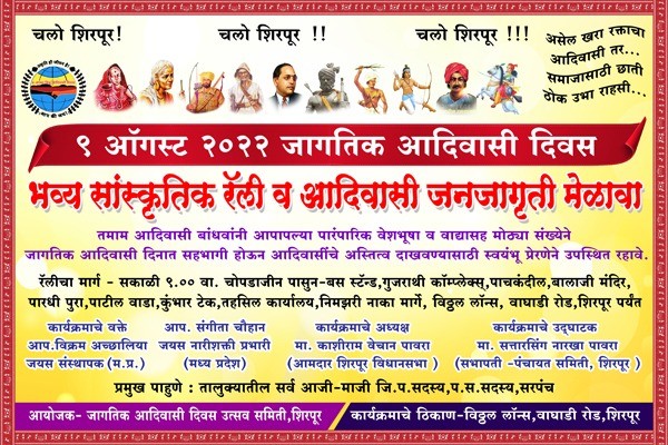दि 9 ऑगस्ट रोजी शिरपूर येथे जागतिक आदिवासी दिवस साजरा करण्यात येणार आहे.शिरपूर शहरात भव्य सांस्कृतिक रॅली,आदिवासी जनजागृती व समाज प्रबोधन मेळावा शिरपूर शहरातील वघाडी रोड वरील विठ्ठल लॉन्स येथे कार्यक्रमाचे आयोजन करण्यात आले आहे. कार्यक्रमासाठी मोठ्या संख्येने उपस्थितीचे आवाहन आयोजक जागतिक आदिवासी दिवस उत्सव समिती,शिरपूर यांच्या वतीने करण्यात आले आहे.