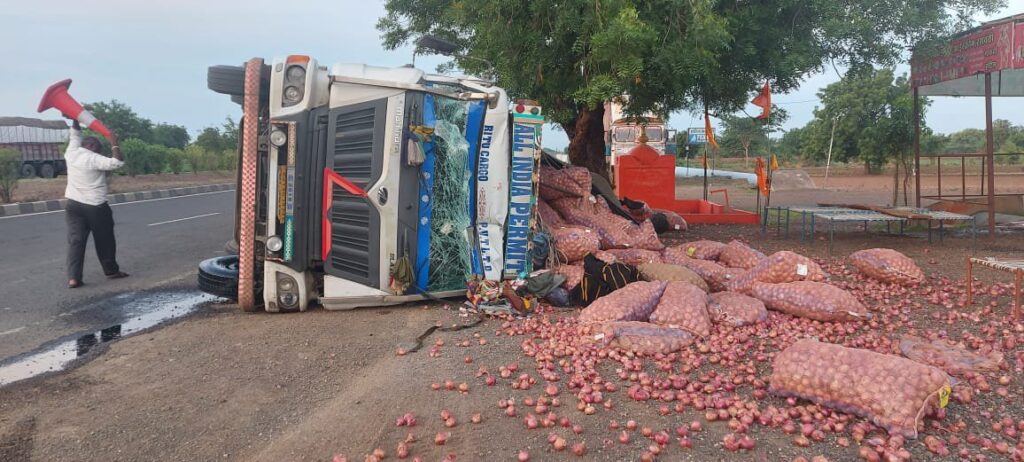 ट्रक पलटी रस्त्यावर कांदेच कांदे