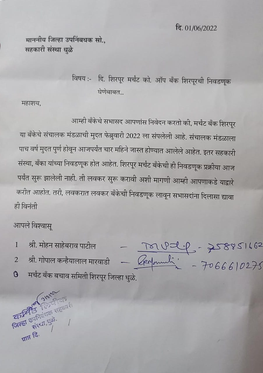 बातमी कट्टा:- दि शिरपुर मर्चंटस् को ऑप बँकेच्या संचालक मंडळाची मुदत चार महिन्यांपूर्वी संपल्यानंतर ही अद्याप नवीन , संचालक मंडळाची निवडणूक लावण्यासाठी जिल्हा उपनिबंधक सहकारी संस्था यांनी सुरूवात केली नाही.म्हणून दि शिरपुर मर्चंटस् को-ऑप बँकेच्या नवीन संचालक मंडळ निवडणुकीची बँक बचाव समिती ने लेखी पत्र देऊन मागणी केली आहे .बँक बचाव समिती तर्फे अध्यक्ष मोहन साहेबराव पाटील आणि उपाध्यक्ष गोपाल कन्हैयालाल मारवाडी यांनी जिल्हा उपनिबंधक सहकारी संस्था यांच्या धुळे कार्यालयात समक्ष भेटून या संदर्भात दि.2 जून रोजी लेखी पत्र देऊन मागणी केली.