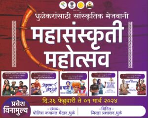 धुळे जिल्ह्यात 26 फेब्रुवारी ते 1 मार्च, 2024 या कालावधीत होणाऱ्या या पाच दिवशीय महासंस्कृती महोत्सवात ढोलताशा पथक, लेझिम पथक, कलशधारी मुली, कानुबाई देखावा, टिपरी नृत्य, वारकरी दिंडी, आदिवासी नृत्य, शिवकालीन शस्त्र कलेचे सादरीकरण, शहनाई तबला जुगलबंदी, शाहिरी शिवगर्जना, गीतगायन, वहीगायन, खान्देशी लोककला आणि आहिराणी लोकगीत, मराठी अहिराणी गीतगायन व नृत्य, भरतनाट्यम, व्यक्तीगत एकपात्री नाटक, काव्यमय संगीत कार्यक्रम, गोंधळ, पोतराज, पोवाडा, हिंगरी व जात्यावरची गाणी, मारुतीची जत्रा बालनाट्य, शाहीरी जलसा, हिंदी मराठी गाण्याची संगीतमय मैफिल, आपली मायबोली, खान्देशी अहिराणी गीते, वारी-सोहळा संत परंपरा, पंढरीच्या वारीची परंपरा आणि वारकरी संप्रदाय यावरील नृत्य नाटीका, मल्लखांब, जगणं तुमचं आमचं काव्यवाचन व गायन मैफिल, महाराष्ट्र दर्शन, अभंग, महाराष्ट्राची संत परंपरा, लावणी, अहिराणी नृत्य, मोगरा फुलला भक्तीमय संगीत कार्यक्रम , दिव्यांग विद्यार्थी कार्यक्रम, बाहुल्यांचे विश्व कटपुतली कार्यक्रम, बेलसर स्वारी नाट्य, कविसंमेलन, अरे संसार संसार कवियत्री बहिणाबाई चौधरी यांच्या जीवनावर आधारीत संगीत व नाट्यमय कलाकृती, तसेच मराठी हिंदी गझलांची भावगर्भ मैफिल इत्यादी भरगच्च कार्यक्रम पाच दिवस आयोजित करण्यात आले आहे.