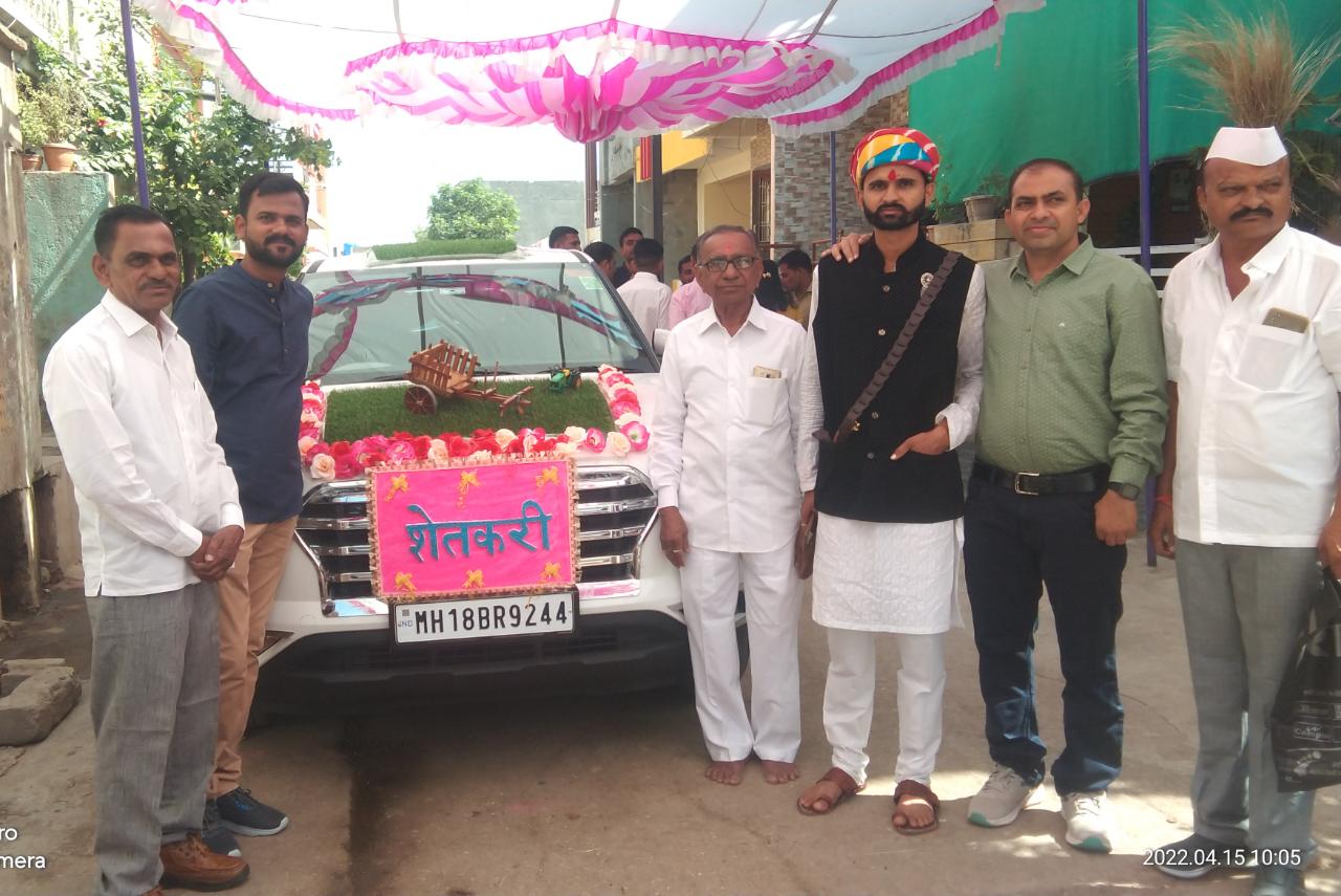 अमळनेर तालुक्यातील कळमसरे येथील योगेंद्रसिंग राजपूत यांचा एकुलता एक मुलगा भुपेंद्रसिंग राजपूत हा वडिलांच्या शेती व्यवसाय जोपासत शिरपुर येथील जगदीशसिंग देशमुख यांच्या सुकन्या चि. सौ. का. हेमांगीदेवी हिच्याशी विवाह झाला.सदयस्थितित विवाह होताना नवरदेवाच्या गाडीला वेगवेगळे फिल्मी बैनर पाहायला मिळतात.मात्र आजच्या तरुणाईला यातून वेगळा संदेश मिळाल्याने नवरदेवासाठी सजवलेली ही मर्सिडीज गाडीवर बैल गाडीचे चिन्ह सर्वाना आकर्षण ठरले असून शेतकरी हाच जगाचा पोशिंदा याचा संदेश भुपेंद्रसिंग यांच्या विवाहातून दिला आहे.यामुळे अमळनेर तालुक्यापासून तर शिरपूर तालुक्यापर्यंत भुपेंद्रसिंग राजपूत यांचे कौतुक होत आहेत.