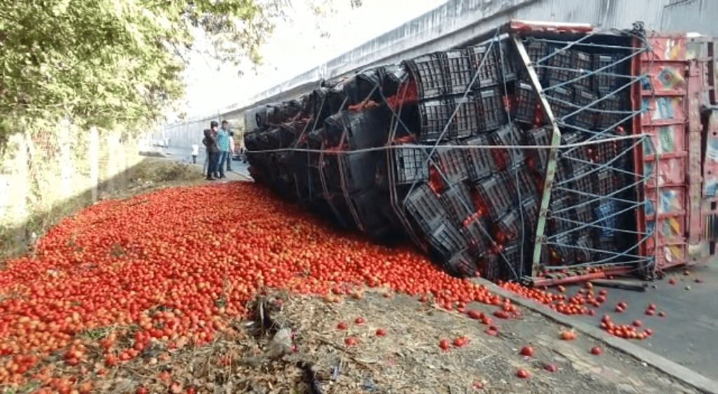 अपघातात ट्रक उलटल्याने ट्रकमधील संपूर्ण टोमॅटो रस्त्यावर फेकले गेल्याने लाखोंचे नुकसान झाल आहे.