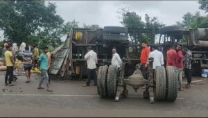 त्यात चालक जाहोर शहा शाहीन शहा आणि सहचालक हैदर शहा रा.उज्जैन मध्यप्रदेश हे किरकोळ जखमी झाले.यावेळी ट्रकमधील बटाटे रस्त्यावर पडले.अपघाताची माहिती मिळताच मृत्युंजय देवदुत , ग्रामस्थ आणि तालुका पोलिसांचे पथक घटनास्थळी दाखल झाले.महामार्ग पोलिस व टोलचे कर्मचारी देखील घटना घटनास्थळी दाखल होत अपघातस्थळावरील ट्रक बाजूला करण्याचे काम सुरु होते.