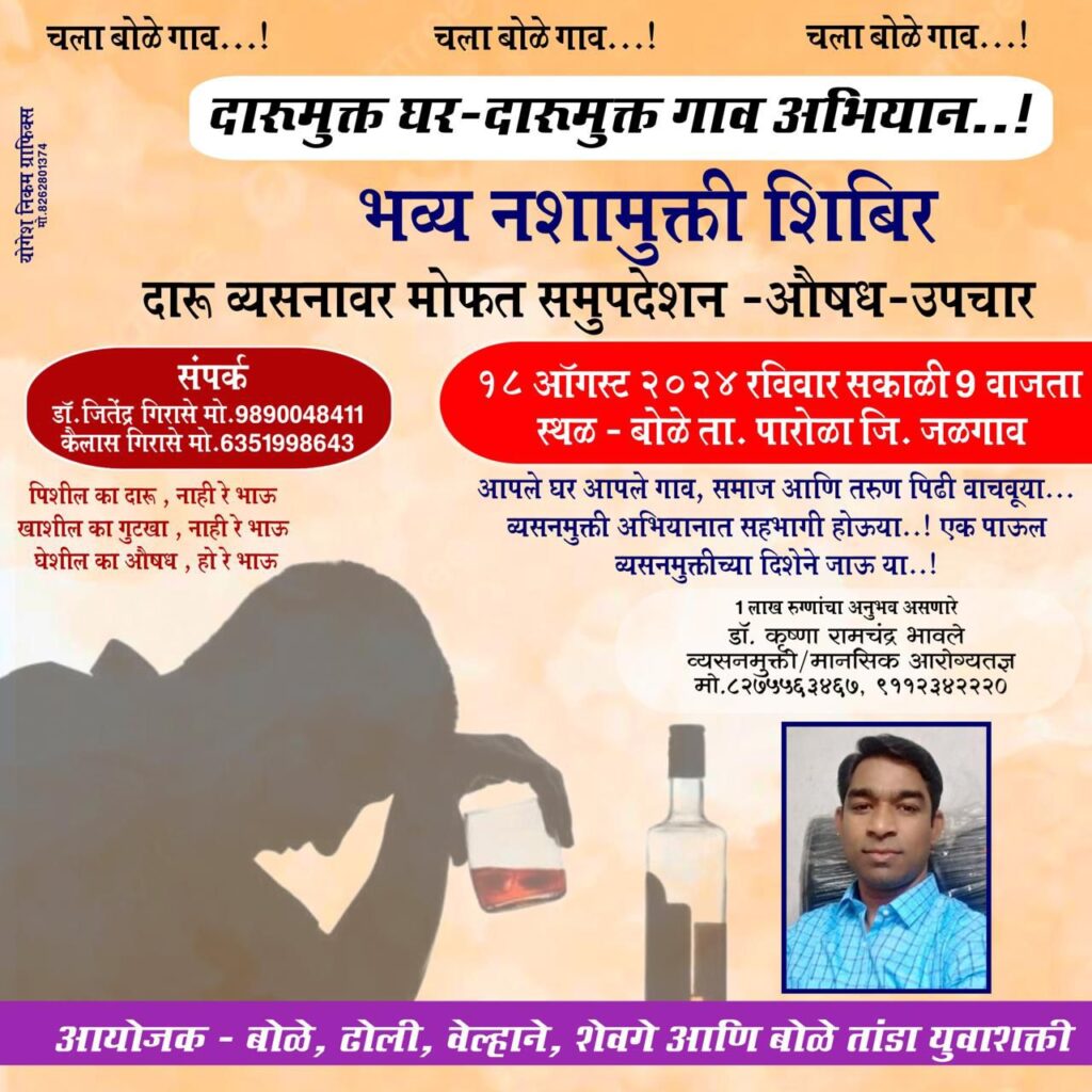 दि १८ ऑगस्ट रोजी पारोळा तालुक्यातील बोळे येथील ग्रामपंचायत प्रांगणात दारु मुक्त घर दारु मुक्त अभियान राबविण्यात येणार असून या अभियानात मोफत व्यसनमुक्ती उपचार शिबिर घेण्यात येणार आहे.या शिबीरात जास्तीत जास्त संख्येने सहभाग नोंदवण्याचे आवाहन अमेरीका स्थित कैलास गिरासे आणि डॉ जितेंद्र गिरासे यांनी केले आहे.