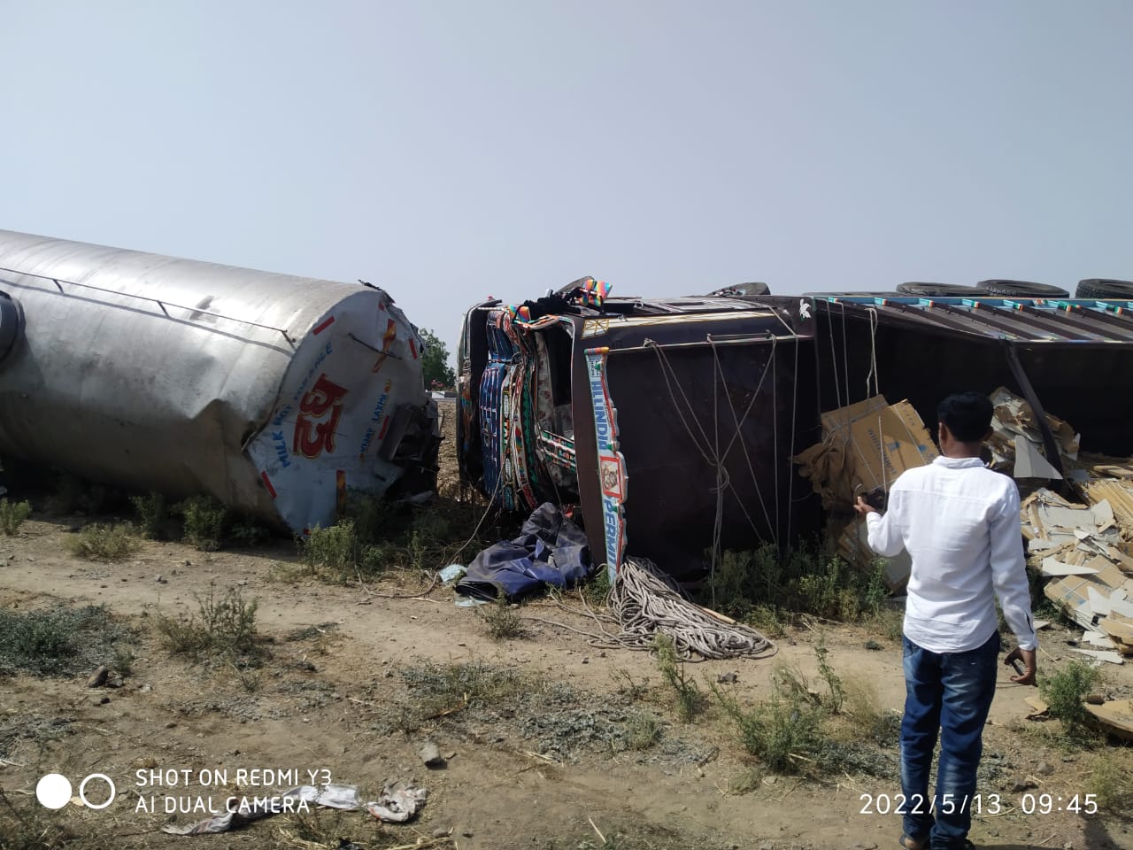 मिळालेल्या प्राथमिक माहिती नुसार पहाटे 3 ते 3:30 वाजेच्या सुमारास जळगाव जिल्ह्यातील मुक्ताईनगर तालुक्यातील घोडसगाव जवळ धुळे येथून दुध घेऊन जाणारे टँकर बंद पडल्याने त्या टँकर मधील दुध दुसऱ्या टँकरमध्ये टाकण्याचे काम सुरु होते. यासाठी क्रेन देखील बोलविण्यात आली होती.घटनास्थळी काम सुरु असतांना समोरून भरधाव टाईल्स घेऊन येणाऱ्या अवजड ट्रकने जोरदार धडक दिली.