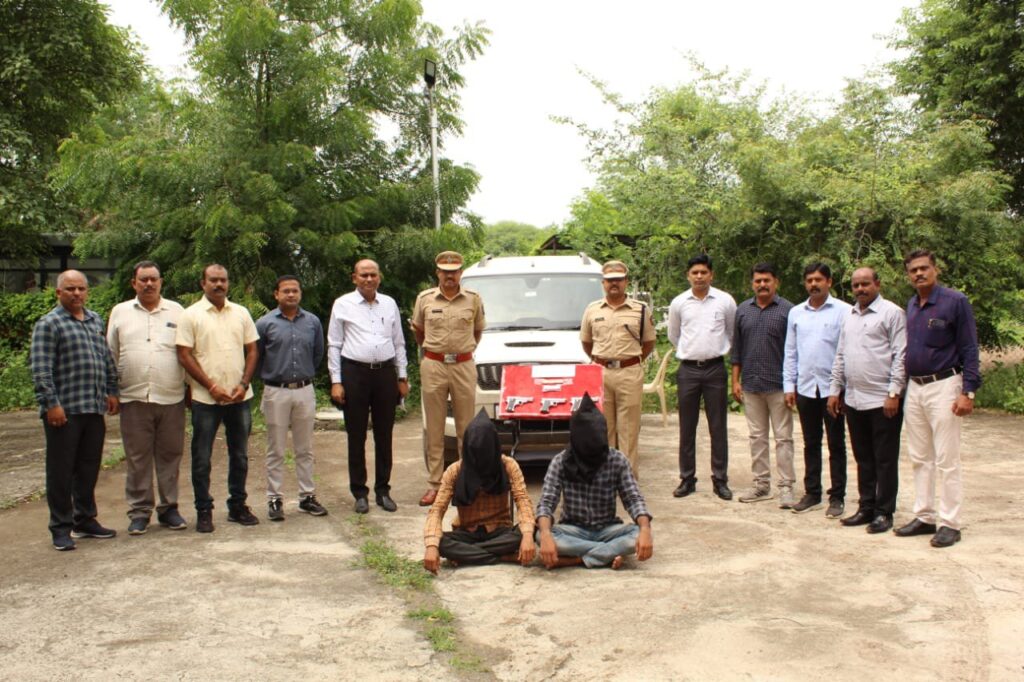 धुळे स्थानिक गुन्हे शाखेचे पोलीस निरीक्षक शिवाजी बुधवंत यांना गोपणीय माहीती प्राप्त झाली होती त्या माहितीच्या आधारे दि 23 रोजी सकाळी 6:30 वाजेच्या सुमारास स्थानिक गुन्हे शाखेचे धुळे पथक शिंदखेडा तालुक्यातील चिलाणे गावाजवळ रस्त्यावर सापळा रचला असता पोलिसांना जी.जे 08 बी.बी 5059 क्रमांकाची स्कार्पियो वाहन येतांना दिसली पोलिसांना वाहनाला थांबवले असता वाहनातील दोघे संशयित पळुन जात असतांना पोलिसांनी दोघांना ताब्यात घेतले पोलिसांनी वाहनाची तपासणी केली असता वाहनातील ड्रायव्हर सिटच्या चेचीस मध्ये तयार केलेल्या कप्पांमध्ये 44 हजार किंमतीचे दोन गावठी पिस्तूल मँगझीनसह,12 हजार किंमतीचे गावठी पिस्तुल मँगझीनसह,3 हजार किंमतीची स्टील बॉडी असलेली मँगझीन व 16 हजार किंमतीचे 16 जिवंत राऊंड(काडतूसे) पोलीसांना मिळुन आली.