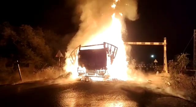 बातमी कट्टा:- रेल्वे मार्ग ओलांडतांना महामार्गावर चालत्या ट्रकला अचानक आग लागल्याची घटना आज पहाटेच्या सुमारास घडली असून यात दोन जण जखमी झाले आहेत.