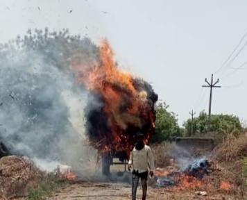 बातमी कट्टा:- रस्त्यावर लोंबकळणाऱ्या तारांच्या शॉर्टशर्कीट झाल्याने चालत्या ट्रॅक्टर मधील दादर कडबाला आग लागल्याने संपूर्ण कडबा जळून खाक झाल्याची घटना घडली आहे.गावकऱ्यांच्या मदतीने आग विझविण्यात आली आहे.
