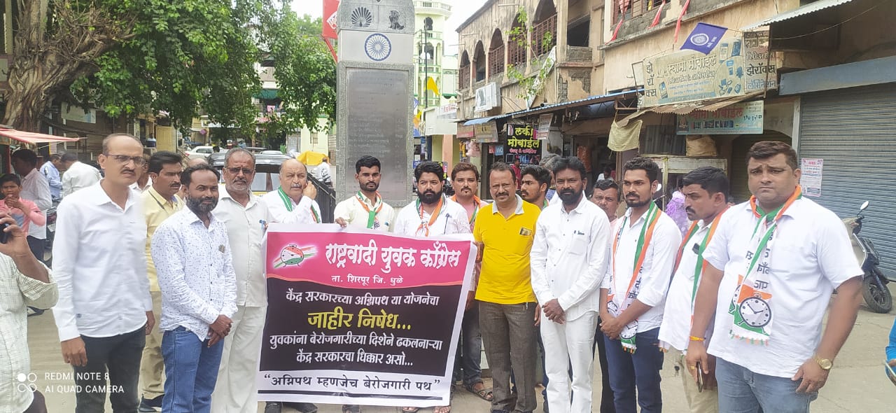 बातमी कट्टा:- राष्ट्रवादी युवक काँग्रेसचे प्रदेशाध्यक्ष मेहबूबभाई शेख यांच्या सूचनेनुसार राष्ट्रवादी युवक काँग्रेसच्या वतीने शिरपूर तालुकाध्यक्ष आशिषकुमार अहिरे यांच्या नेतृत्वाखाली आज शिरपूर येथील मुख्य बाजारपेठेतील पाताळेश्वर मंदिर जवळील शहीद स्मारकाच्या ठिकाणी केंद्र सरकारने ठेकेदारी पद्धतीने राबविण्यात येणाऱ्या सैनिक भरती प्रक्रियेला विरोध दर्शवित आंदोलन करण्यात आले.